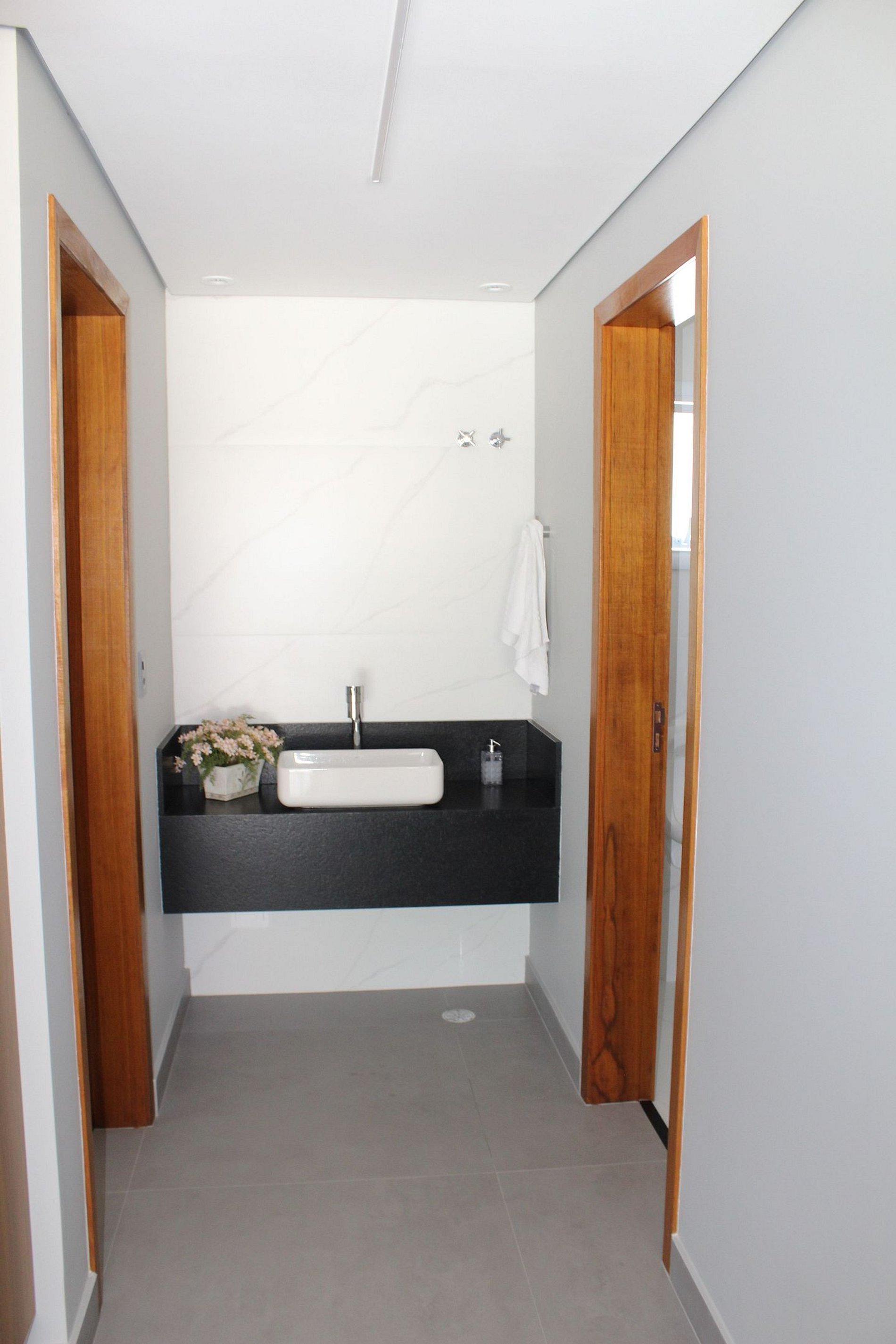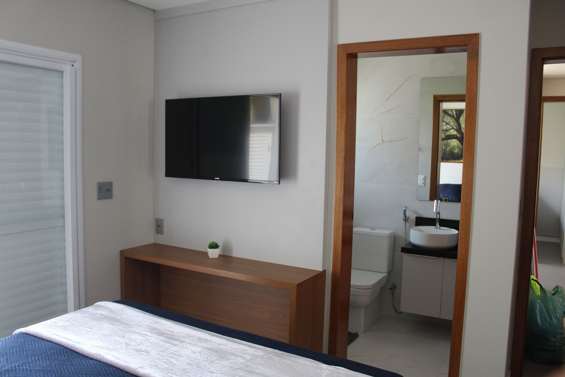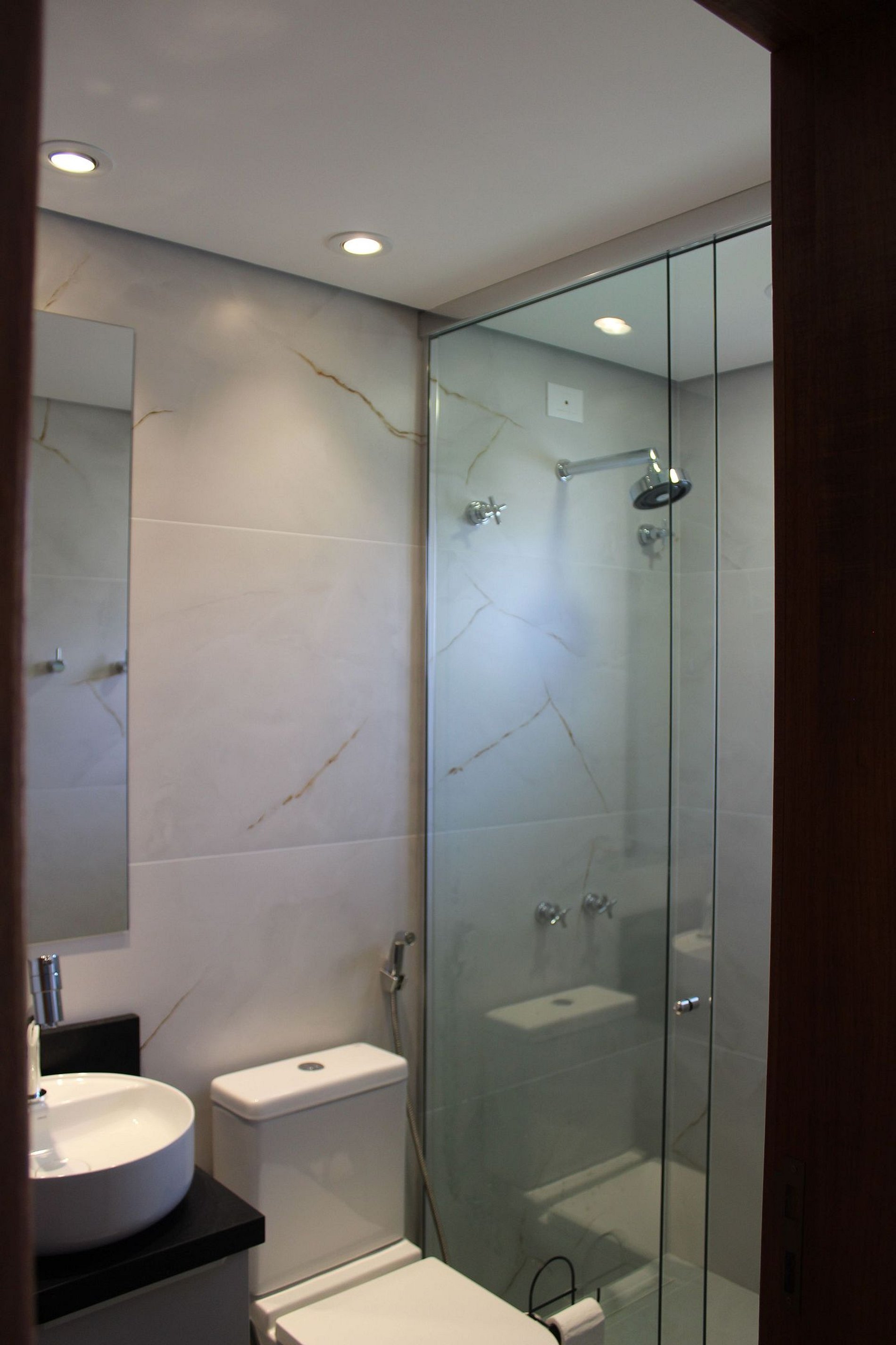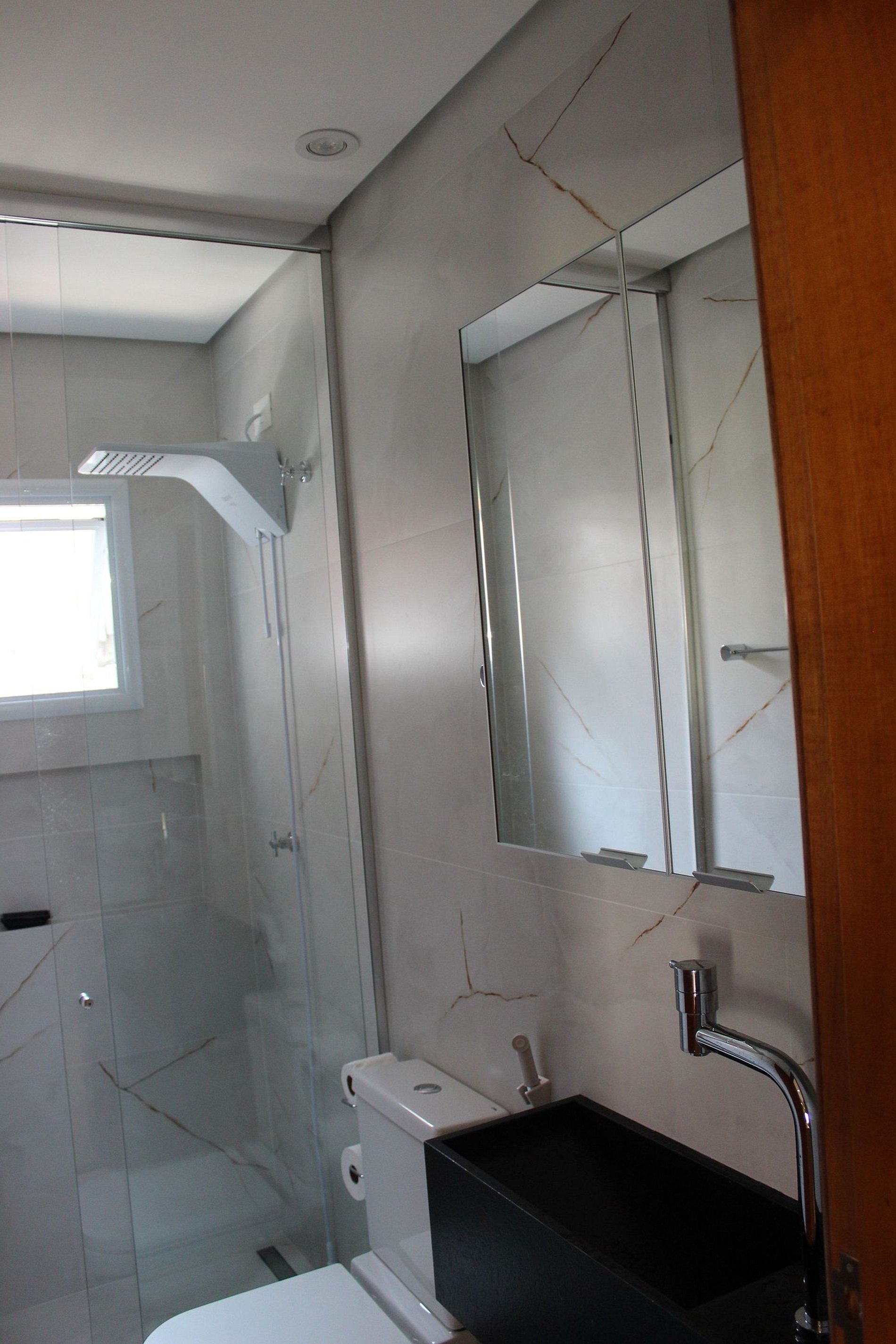 - Banheiro privativo em mármore com box amplo;
