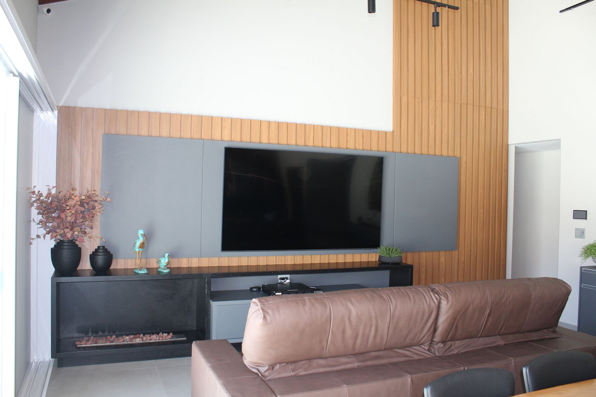 • Sala de estar com sofás modulados, TV 55" e lareira elétrica;